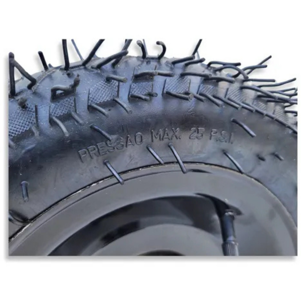 Roda com Pneu com Câmera de Ar, Pneu 2 Lonas, proporcionando maior RESISTÊNCIA e CAPACIDADE DE CARGA.
